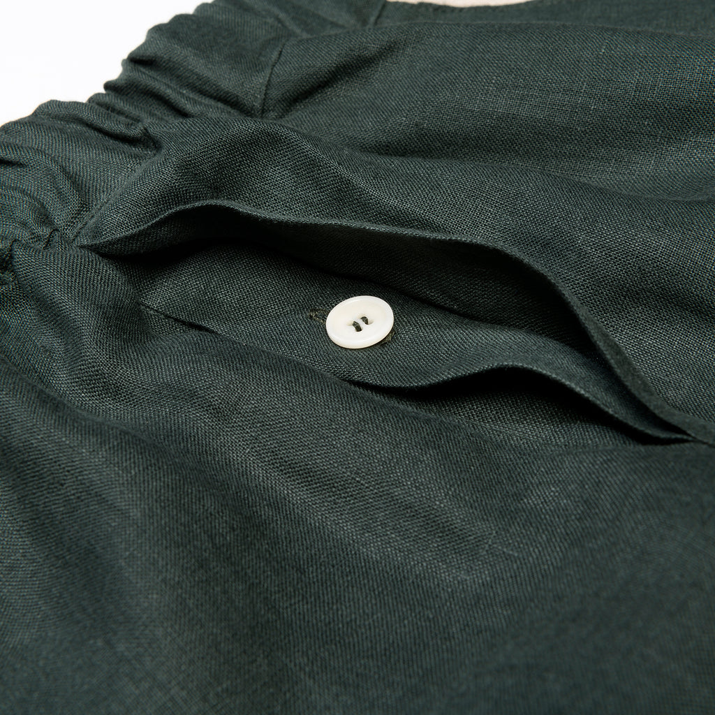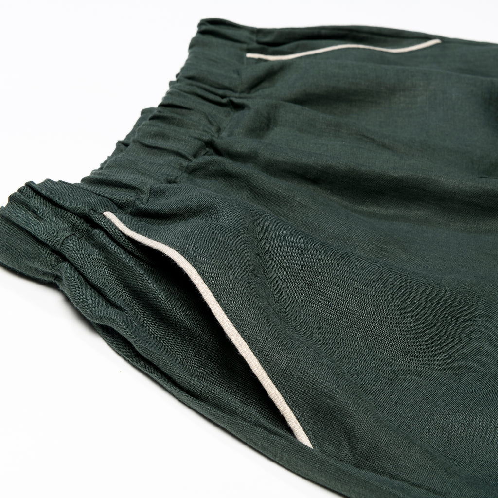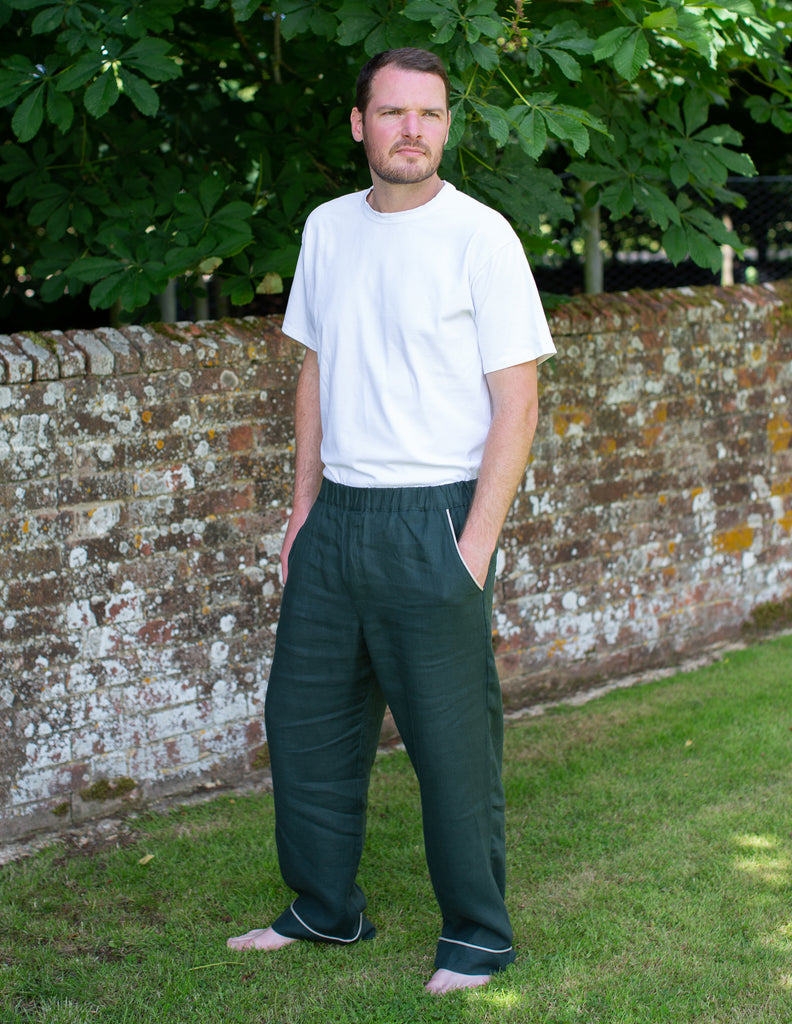 Crafted in Ireland from 100% Irish Linen, our men's green linen pyjamas are also available as just bottoms. Finished with oatmeal piping for a timeless look, the trousers feature a wide elasticated waistband with a button fly and pockets. Buttons are made from biodegradable corozo.
