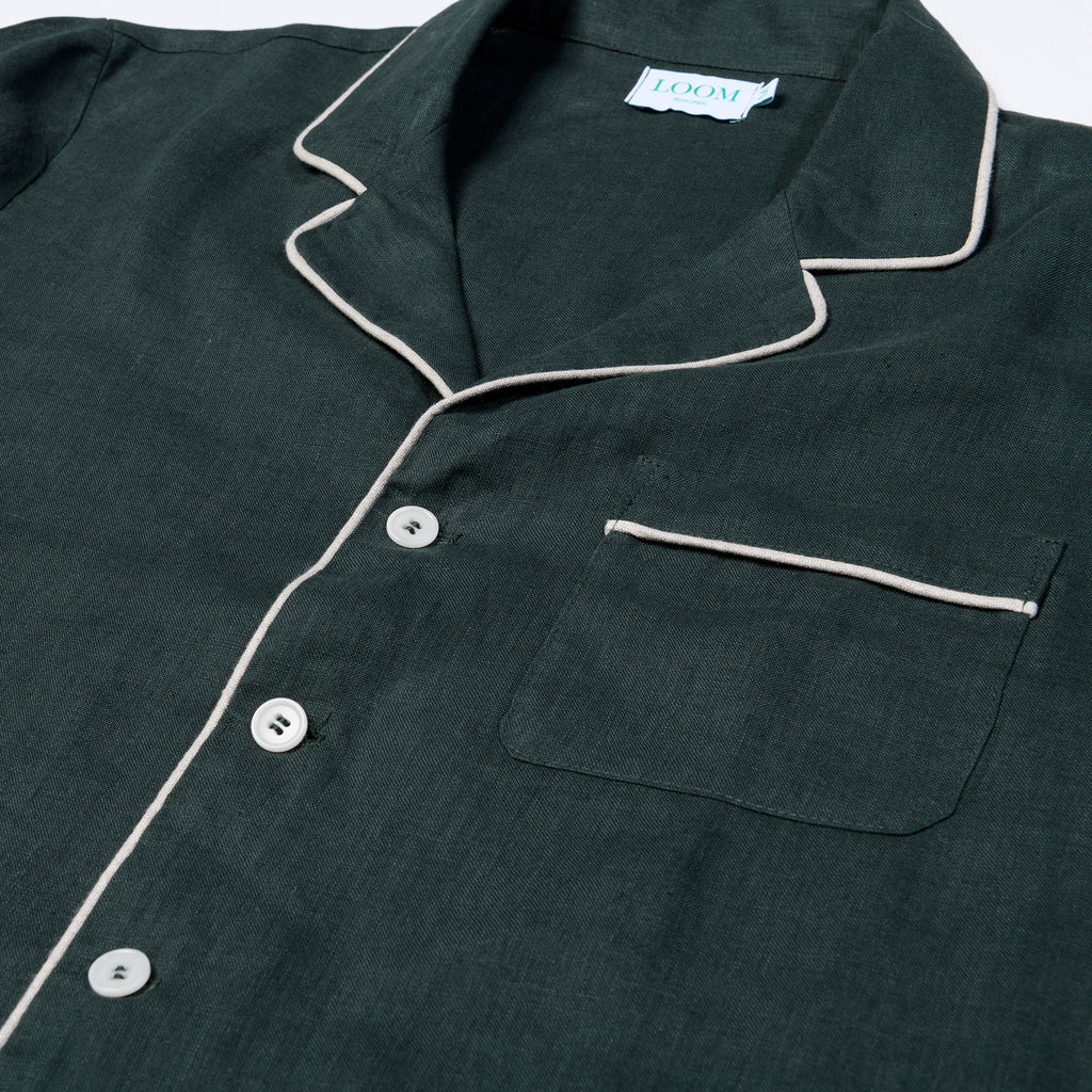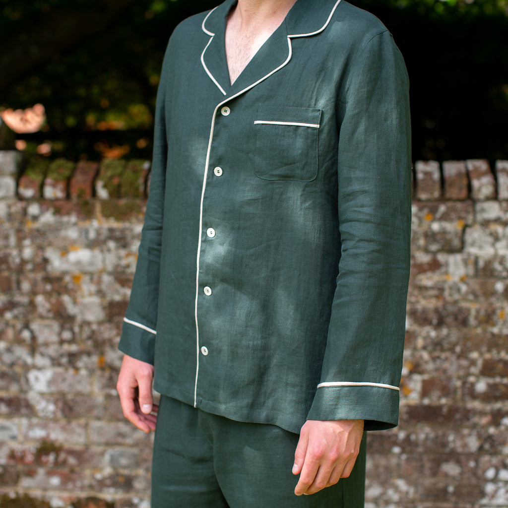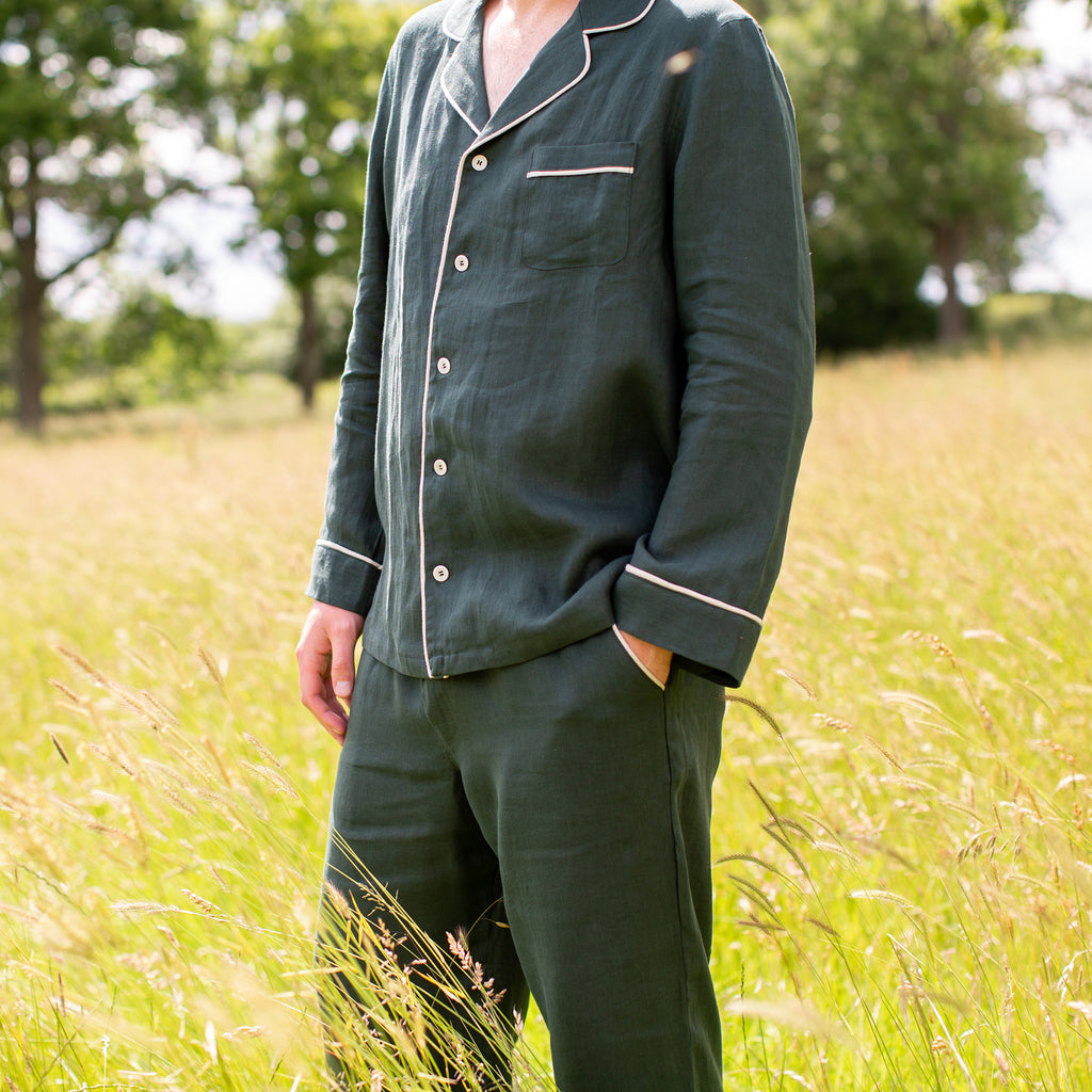Crafted in Ireland from 100% Irish Linen, our men's green linen pyjamas are finished with oatmeal piping creating a timeless style that won’t change with the seasons. The trousers feature a wide elasticated waistband with a button fly and pockets. Buttons are made from biodegradable corozo.