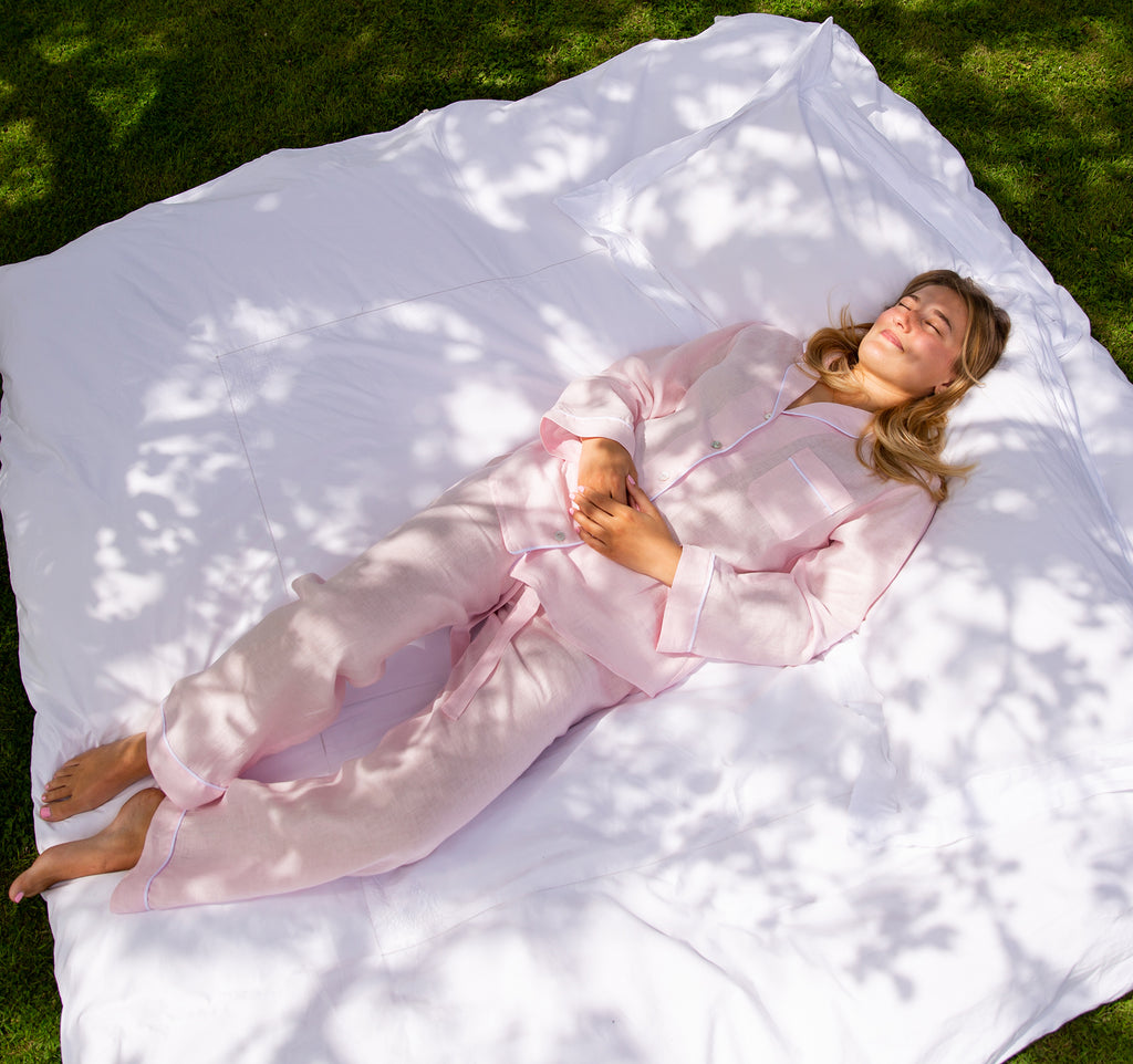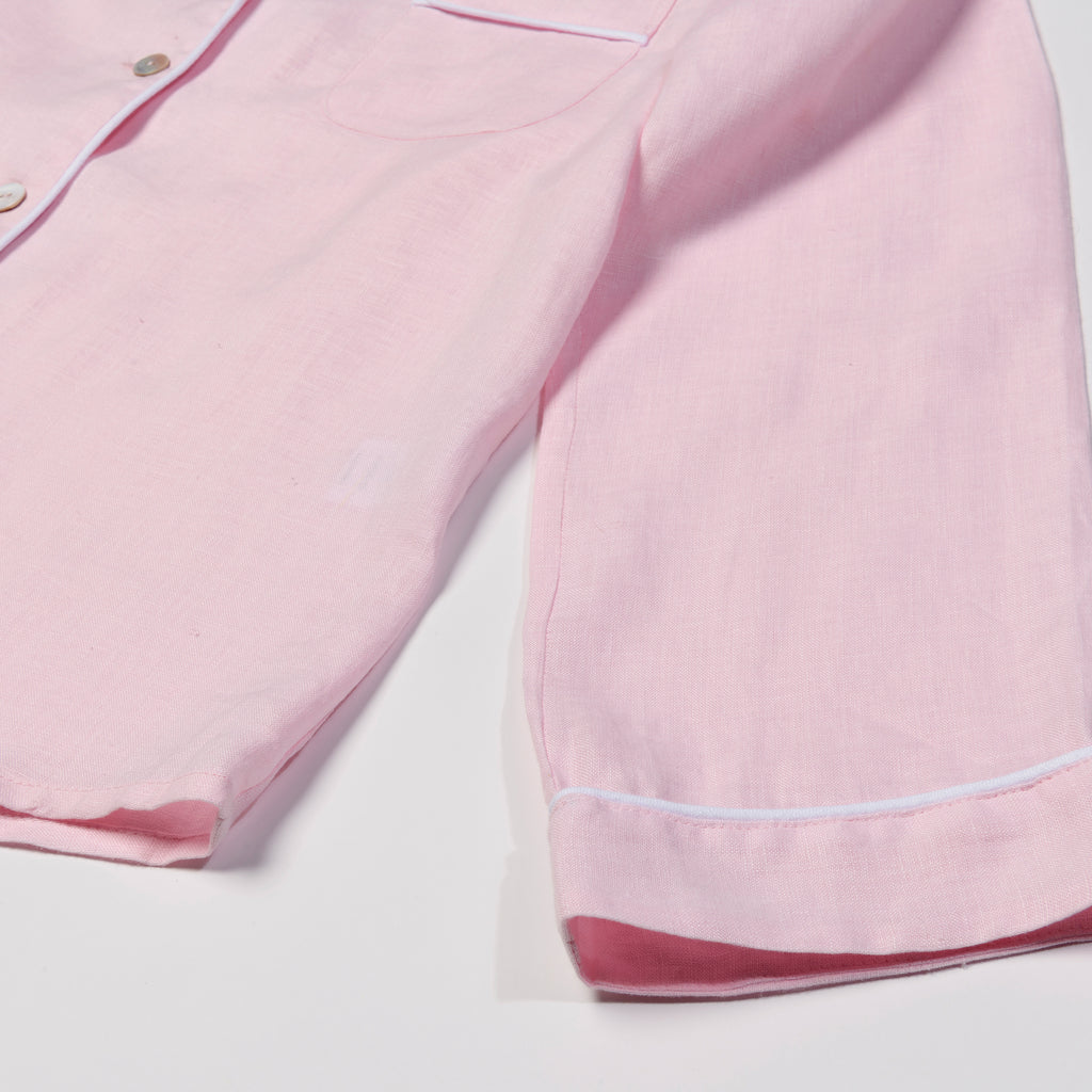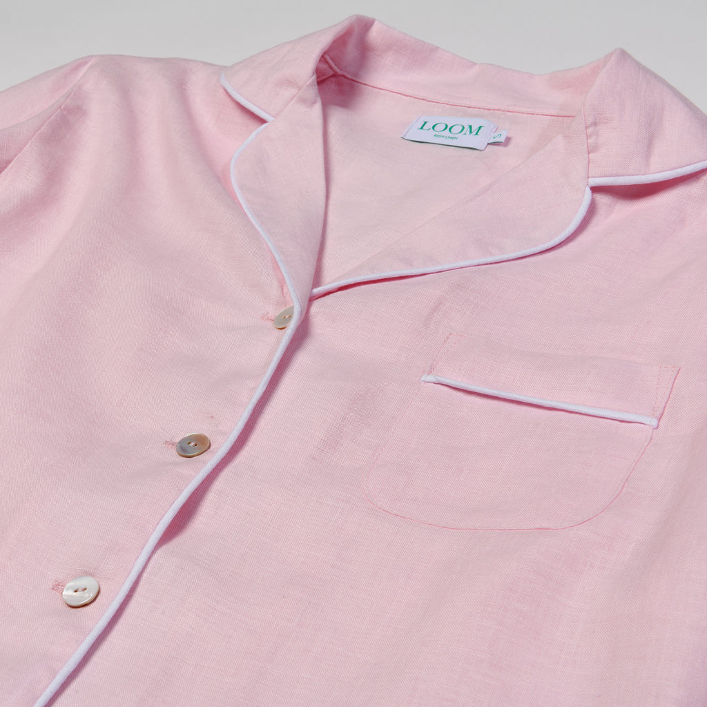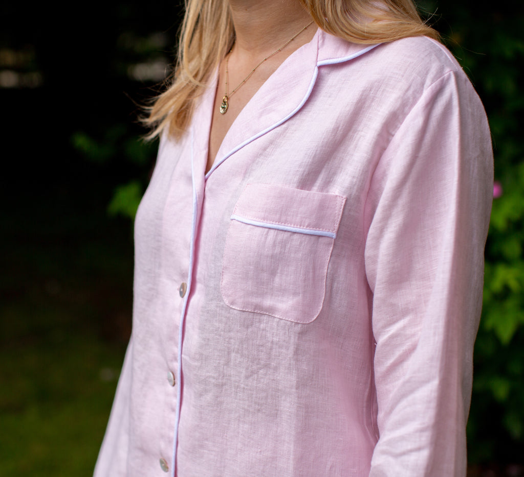 Crafted in Ireland from 100% Irish Linen, our pale pink linen pyjamas are finished with white piping creating a timeless style that won’t change with the seasons. The trousers feature a wide elasticated waistband with a drawstring front and buttons are made from shell.