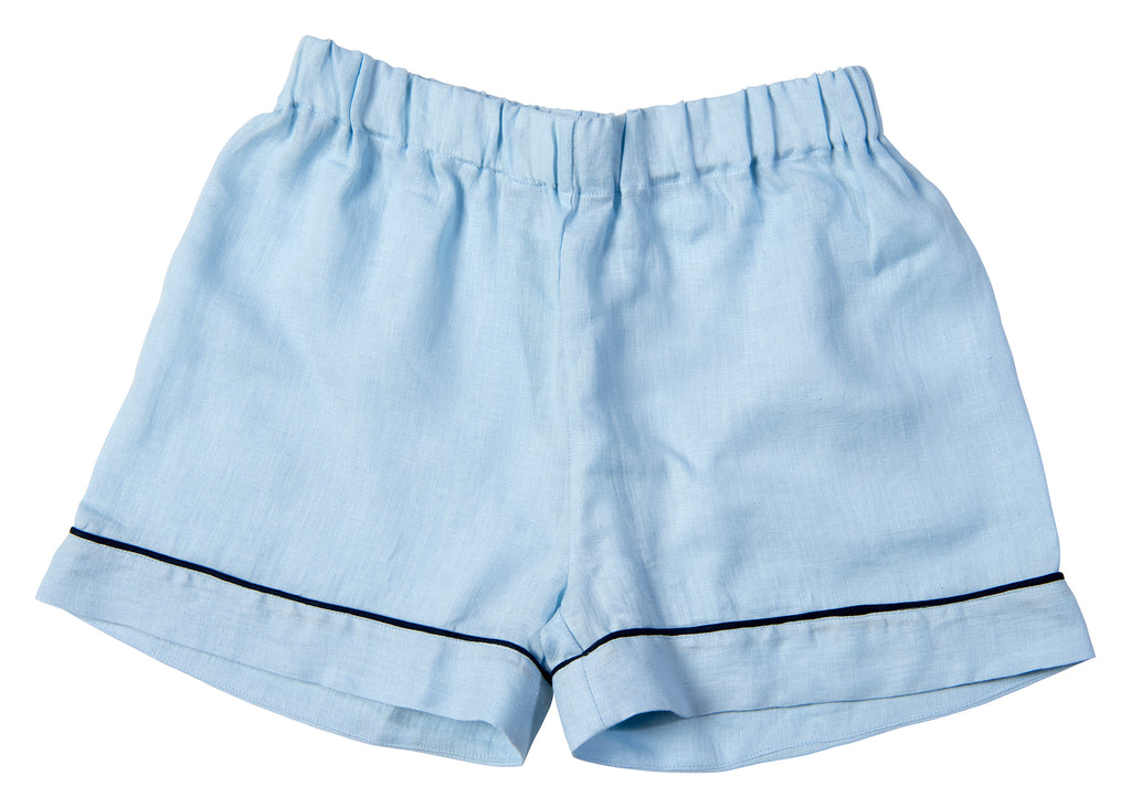 Our baby blue linen pyjama shorts sets are made in Ireland from 100% Irish Linen and finished with navy piping for a timeless look. The shorts feature a wide elasticated waistband and the buttons are made from shell.