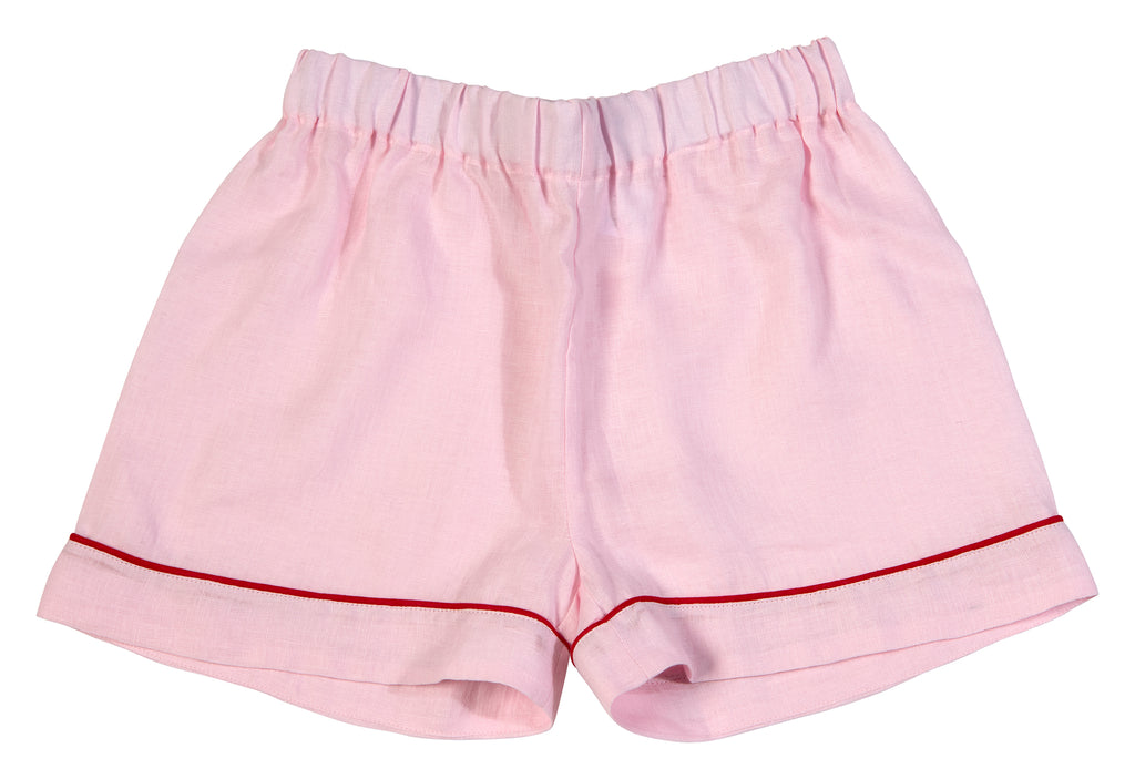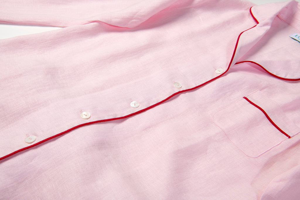 Crafted from 100% Irish Linen and made in Ireland, our pale pink linen pyjama shorts set is finished with red piping for a timeless look that won’t change with the seasons. The shorts feature a wide elasticated waistband and buttons are made from shell.