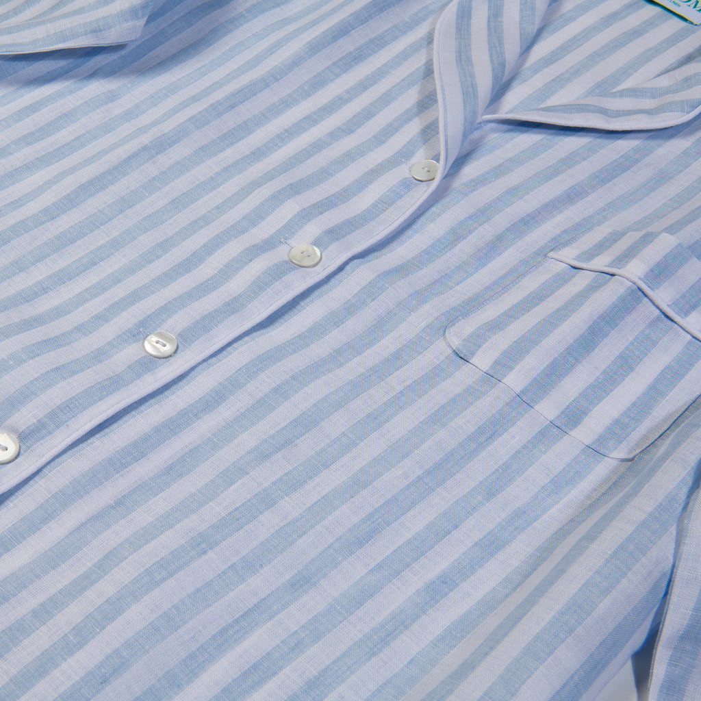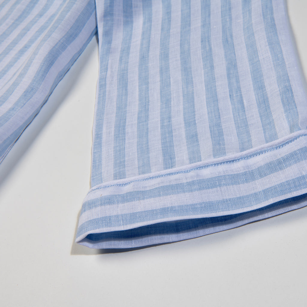 Our limited edition striped pyjama sets are crafted in Ireland from 100% Irish Linen and the blue pastel stripes are finished with white piping. These pyjamas are truly limited edition, as well as, kind on the environment because they are made from deadstock fabric which helps to reduce waste within the textiles industry. The trousers feature a wide elasticated waistband with a drawstring front and buttons are made from shell.