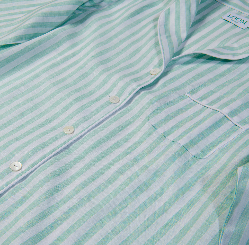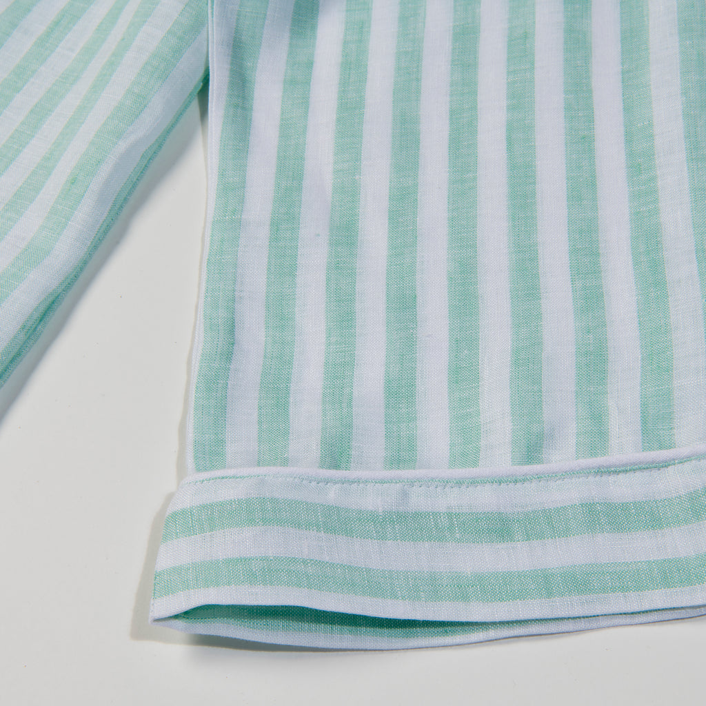 Our limited edition striped pyjama sets are crafted in Ireland from 100% Irish Linen and the mint pastel stripes are finished with white piping. These pyjamas are truly limited edition, as well as, kind on the environment because they are made from deadstock fabric which helps to reduce waste within the textiles industry. The trousers feature a wide elasticated waistband with a drawstring front and buttons are made from shell.